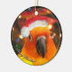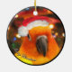 Cute Sun Conure ornament! The parrot wears a bright red Santa hat in front of a colourful winter background. Fun for the bird lover's Xmas tree this holiday season.
