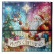 A jolly Santa points at a playful reindeer amidst colourful stained glass, surrounded by a Christmas tree and beautifully wrapped gifts.