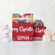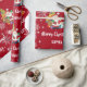 Modern, cute, festive custom-made Christmas gift wrap for kids, with Santa, a Christmas tree, lots of presents, the greeting "Merry Christmas" in stylish typography, and a personalized name. On a Xmas red background, with snowflakes.
