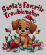 Santa's Favourite Troublemaker Festive Puppy. Drawn in a delightful cartoon style, this adorable brown puppy with floppy ears playfully tangles in red ribbon and Christmas lights. Adorned with a quirky Santa hat and the cheeky caption 'Santa’s Favourite Troublemaker', this design captures festive mischief.