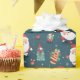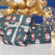 his wrapping paper features a merry assortment of Santa Clauses in various poses, Christmas trees, and presents, all arranged in a seamless pattern against a dark teal background with snowflake accents. It's perfect for adding a touch of whimsy and joy to your gift-giving this holiday season.