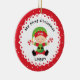 Baby's First Christmas Ornament features an adorable little elf baby boy set on a red & white polka dotted background! Easy to personalize with your info & date