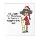 Funny holiday T-shirts, mugs, cards, stickers, buttons, bags, keychains, ornaments, and more sure to make anyone laugh features a female in a Santa hat and red dress with a long list saying "All I want for Christmas is Santa's naughty boy list!".