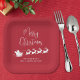 Fun seasonal red and white paper plates for your Christmas holiday parties and table decor featuring a silhouette of Santa's sleigh pulled by reindeers flying through air, "Merry Christmas" in a modern script and your name or event in simple typography.