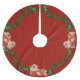 Christmas tree skirt in red with a Jolly Santa Claus and seasonal holly and berries.