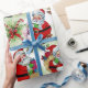 This vibrant, repeating pattern has a distinct mid-century illustration style set against a light, speckled green and white background. It features several vignettes of classic Santa Claus engaging in holiday preparations, such as sitting on a stool painting an ornament, standing with a large sack of gifts, and preparing to go down a chimney, often accompanied by a gentle reindeer. Interspersed between the Santa figures are detailed sprigs of holly or pine branches tied with red bows and featuring candy canes and small ornaments, creating a busy yet cheerful festive scene.