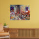 A beautiful vintage poster featuring Santa with his elves in the workshop.