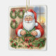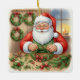 Bring the heartwarming magic of a cozy Christmas to your tree with this charming square ceramic ornament! Featuring a delightful illustration of Santa Claus happily crafting a festive evergreen wreath in his workshop, complete with a roaring fireplace, decorated tree, and plenty of crafting supplies.