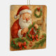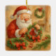 Bring the heartwarming magic of a cozy Christmas to your tree with this charming square ceramic ornament! Featuring a delightful illustration of Santa Claus happily crafting a festive evergreen wreath in his workshop, complete with a roaring fireplace, decorated tree, and plenty of crafting supplies.