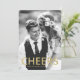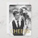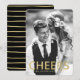 Célébrez le Nouvel An avec vos amis et votre famille en leur envoyant un carte photo moderne du Nouvel An. Le carte photo élégant comporte le mot "Cheer" dans une police de feuille d'or et des espaces réservés pour le texte et une photo. L'arrière de la carte est orné d'un arrière - plan noir avec des bandes dessinées à la main de faux feuille d'or. La couleur noire peut être changée en une couleur de votre choix avec l'outil Personnaliser It.