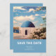 Il s'agit d'une peinture acrylique à la main de Santorin Grèce pour une sauvegarde de la date. Avec un arrière - plan bleu clair, ce design moderne et simple est parfait pour un mariage de destination en Grèce. Idéal pour les amateurs de plage, de fleurs, d'art et d'architecture. Customisez et personnalisez avec vos informations de mariage.