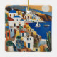 The image shows a painting of a Greek island with colourful buildings and with a view of the sea in the background and boats in the harbour. The buildings are painted in bright colours, with blue and white roofs and red and yellow walls. There are also some trees and shrubs growing on the hillsides. The overall effect is one of a vibrant and lively island, with a sense of movement and activity. The colours and shapes in the painting create a sense of depth and perspective. The painting captures the essence of the Santorini, with its bright colours and lively atmosphere.
