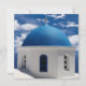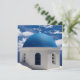 Flat card with Santorini, Greece photo with blue sky and white clouds.