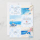 A Greece themed destination wedding invitation featuring watercolor illustrations of Santorini scenery including Aegean Sea, beach umbrellas, cliffs, and more. Also features sheer blue tile and floral details.