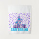 This image depicts a cartoon illustration of the iconic white-washed buildings of Santorini, Greece. The houses are clustered together and feature blue accents, reflecting the traditional architecture of the island. The background is filled with a scattering of purple stars, creating a whimsical and playful atmosphere. The word "SANTORINI" is written in bold, blue letters at the bottom of the image, further emphasizing the theme. This image is a colourful and cheerful representation of the beautiful and popular tourist destination.