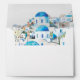Destination wedding envelopes with a surprise blue & white watercolor landscape painting inside.