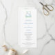 This classic wedding program design features a timeless watercolor botanical crest in sap green and mid blue.