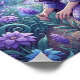This fantasy poster features a moonlit fairy-garden scene: a serene woman in a flowing purple gown tends glowing blooms amid sapphire butterflies, a winding path to a cozy cottage.