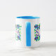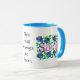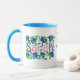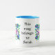 A good quality white 'ringer' mug with powder blue rim and handle. The design, front and back, is a handpainted paper collage of flowers, leaves and the name 'Sarah' and the text in between reads, 'This mug belongs to Sarah'. See also matching gifts, greeting card and apparel. Dishwasher and mictrowave safe.
