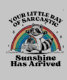 A cheeky raccoon stands gleefully under a vibrant rainbow with arms raised, surrounded by sparkles. The humourous text reads, "Your little ray of sarcastic sunshine has arrived," combining charm with a sassy vibe.