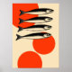 This minimalist graphic illustration depicts sardines against bold black and vibrant red sun discs. A perfect choice for those who appreciate a simple yet modern artistic representation of marine life.