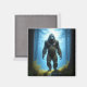 Sasquatch of Bigfoot walking in the woods between tall pine trees magnet.