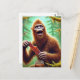Sasquatch in mossy forest with a jar of beef jerky postcard