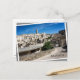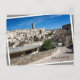 Postcard of the old architecture and the cave houses of the Sassi di Matera city in the Basilicata region in Italy with a white edge and the text 'Matera'. The photo is a bit rotated to create the illusion of it laying loose.