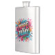 The product is a good size and came exactly as it was pictured. The lid is not attached to the flask, which could be dangerous on drunken nights... The print came out surprisingly well and looks very sharp. Would definitely recommend.