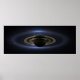 The Day the Earth Smiled On July 19, 2013, in an event celebrated the world over, NASA's Cassini spacecraft slipped into Saturn's shadow and turned to image the planet, seven of its moons, its inner rings -- and, in the background, our home planet, Earth. With the sun's powerful and potentially damaging rays eclipsed by Saturn itself, Cassini's onboard cameras were able to take advantage of this unique viewing geometry. They acquired a panoramic mosaic of the Saturn system that allows scientists to see details in the rings and throughout the system as they are backlit by the sun. This mosaic is special as it marks the third time our home planet was imaged from the outer solar system; the second time it was imaged by Cassini from Saturn's orbit; and the first time ever that inhabitants of Earth were made aware in advance that their photo would be taken from such a great distance. With both Cassini's wide-angle and narrow-angle cameras aimed at Saturn, Cassini was able to capture 323 images in just over four hours. This final mosaic uses 141 of those wide-angle images. Images taken using the red, green and blue spectral filters of the wide-angle camera were combined and mosaicked together to create this natural-colour view. A brightened version with contrast and colour enhanced, a version with just the planets annotated, and an unannotated version are also available. This image spans about 404,880 miles (651,591 kilometres) across. The outermost ring shown here is Saturn's E ring, the core of which is situated about 149,000 miles (240,000 kilometres) from Saturn. The geysers erupting from the south polar terrain of the moon Enceladus supply the fine icy particles that comprise the E ring; diffraction by sunlight gives the ring its blue colour. Enceladus (313 miles, or 504 kilometres, across) and the extended plume formed by its jets are visible, embedded in the E ring on the left side of the mosaic. At the 12 o'clock position and a bit inward from the E ring lies the barely discernible ring created by the tiny, Cassini-discovered moon, Pallene (3 miles, or 4 kilometres, across). (For more on structures like Pallene's ring, see PIA08328). The next narrow and easily seen ring inward is the G ring. Interior to the G ring, near the 11 o'clock position, one can barely see the more diffuse ring created by the co-orbital moons, Janus (111 miles, or 179 kilometres, across) and Epimetheus (70 miles, or 113 kilometres, across). Farther inward, we see the very bright F ring closely encircling the main rings of Saturn. Following the outermost E ring counter-clockwise from Enceladus, the moon Tethys (662 miles, or 1,066 kilometres, across) appears as a large yellow orb just outside of the E ring. Tethys is positioned on the illuminated side of Saturn; its icy surface is shining brightly from yellow sunlight reflected by Saturn. Continuing to about the 2 o'clock position is a dark pixel just outside of the G ring; this dark pixel is Saturn's Death Star moon, Mimas (246 miles, or 396 kilometres, across). Mimas appears, upon close inspection, as a very thin crescent because Cassini is looking mostly at its non-illuminated face. The moons Prometheus, Pandora, Janus and Epimetheus are also visible in the mosaic near Saturn's bright narrow F ring. Prometheus (53 miles, or 86 kilometres, across) is visible as a faint black dot just inside the F ring and at the 9 o'clock position. On the opposite side of the rings, just outside the F ring, Pandora (50 miles, or 81 kilometres, across) can be seen as a bright white dot. Pandora and Prometheus are shepherd moons and gravitational interactions between the ring and the moons keep the F ring narrowly confined. At the 11 o'clock position in between the F ring and the G ring, Janus (111 miles, or 179 kilometres, across) appears as a faint black dot. Janus and Prometheus are dark for the same reason Mimas is mostly dark: we are looking at their non-illuminated sides in this mosaic. Midway between the F ring and the G ring, at about the 8 o'clock position, is a single bright pixel, Epimetheus. Looking more closely at Enceladus, Mimas and Tethys, especially in the brightened version of the mosaic, one can see these moons casting shadows through the E ring like a telephone pole might cast a shadow through a fog. In the non-brightened version of the mosaic, one can see bright clumps of ring material orbiting within the Encke gap near the outer edge of the main rings and immediately to the lower left of the globe of Saturn. Also, in the dark B ring within the main rings, at the 9 o'clock position, one can see the faint outlines of two spoke features, first sighted by NASA's Voyager spacecraft in the early 1980s and extensively studied by Cassini. Finally, in the lower right of the mosaic, in between the bright blue E ring and the faint but defined G ring, is the pale blue dot of our planet, Earth. Look closely and you can see the moon protruding from the Earth's lower right. (For a higher resolution view of the Earth and moon taken during this campaign, see PIA14949.) Earth's twin, Venus, appears as a bright white dot in the upper left quadrant of the mosaic, also between the G and E rings. Mars also appears as a faint red dot embedded in the outer edge of the E ring, above and to the left of Venus. For ease of visibility, Earth, Venus, Mars, Enceladus, Epimetheus and Pandora were all brightened by a factor of eight and a half relative to Saturn. Tethys was brightened by a factor of four. In total, 809 background stars are visible and were brightened by a factor ranging from six, for the brightest stars, to 16, for the faintest. The faint outer rings (from the G ring to the E ring) were also brightened relative to the already bright main rings by factors ranging from two to eight, with the lower-phase-angle (and therefore fainter) regions of these rings brightened the most. The brightened version of the mosaic was further brightened and contrast-enhanced all over to accommo
