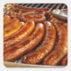 German sausages sizzling on the grill ready to be served. Hot, tasty and delicious.