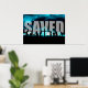 Sauvé Jésus Salut Chrétien affiche d'art fin conçue par l'artiste Rick Short montrant Jésus, la croix et les gens de tous les milieux qui sont venus le connaître. Les tempêtes de la vie peuvent sembler sombres et accablantes comme le prédit cette affiche, mais remarquez que les gens ne semblent pas inquiets, ils sont au repos et à l'aise dans les bras de leur Seigneur et Sauveur, Jésus.