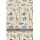 Bring the magic of the savanna to a child's space with this charming all-over wallpaper. The pattern features friendly, stylized safari animals, including the lion, giraffe, elephant, zebra, and hippo, playfully arranged alongside acacia trees and a rising sun. The soft, neutral color palette and creamy background create a light, cheerful, and gender-neutral environment. Perfect for an accent wall or an entire room to encourage imagination and happy dreams. Search ID1259 to see other products with this cute safari pattern. Note: design adapted from generative content.