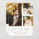 Elegant and simple save our date announcement. This template features space for 3 of your favourite couples photos in white with cool hand written calligraphy in gold. Easy to edit with your own unique details.