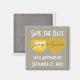 This refrigerator magnet features two gold hearts (one with white-washed centre, the other solid gold) overlaid by template text for the names of the bride and groom. The template text "Save the Date" appears above the hearts and template text for the occasion and date appear below the hearts. Click ""Customize" to re-size/re-position gold hearts, change background colour, add/revise text. Select font style, size and colour. The gold hearts design can be customized for an engagement party, bridal shower, rehearsal dinner, wedding, anniversary or valentine's party favour or save-the-date.