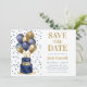 Cette fabuleuse fête du 70e anniversaire pour hommes Sauvez la carte Date avec un gâteau bleu marine et or 2 couches avec ballons bleu marine et or, le numéro 70 en or et confetti bleu brillant serait parfait pour demander aux gens de mettre cette date spéciale de côté pour la prochaine fête du 70e anniversaire. Traditionnel et classique, il est frais, moderne et contemporain. L'arrière est une feuille bleu marine de coordination.