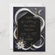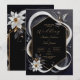 Cette image présente un design abstrait et sophistiqué. La conception présente un cadre hexagonal noir surligné d'or, dressé contre un arrière - plan foncé. Des éléments en ruban blanc et gris encerclent gracieusement le cadre, créant un sentiment de mouvement et d'élégance. Le design est agrémenté de délicats détails dorés et de petits feuilles stylisés aux tons feutrés. En bas à gauche, une grande fleur blanche avec centre doré apporte une touche de beauté organique à la composition. L'esthétique générale est moderne et raffinée, avec une palette de couleurs monochromatiques qui s'accompagne de subtiles touches dorées. Un design qui conviendra à merveille à une mariage chic et contemporaine, notamment sur le thème de la cravate noire ou minimaliste. Personnalisez le texte concernant les noms et les détails du mariage. Vous pouvez télécharger la carte sur votre appareil mobile ou votre ordinateur.