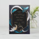 Cette image présente un design abstrait élégant et moderne. Le design se concentre autour d'un cadre hexagonal foncé avec un contour doré, dressé contre un arrière - plan foncé. Des éléments en forme de rubans dans les tons turquoises, blancs et dorés encerclent gracieusement le cadre, ajoutant un sentiment de mouvement et de sophistication. Une fleur blanche aux accents dorés apporte une touche de beauté naturelle à la composition par ailleurs abstraite. L'ensemble est d'une élégance raffinée, avec une esthétique contemporaine mêlant éléments organiques et géométriques. Ce design conviendra bien à une mariage moderne et design, peut-être à une palette de couleurs privilégiant les tons sombres, turquoises et dorés. Personnalisez le texte concernant les noms et les détails du mariage. Vous pouvez télécharger la carte sur votre appareil mobile ou votre ordinateur.