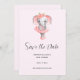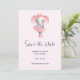 Enregistrez la carte de date avec une adorable illustration. Un éléphant gris ceint d'un tutu rose et des fleurs dansant le ballet, en pointe.