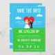 Ce faire-part amusant, unique et délicieusement geeky sauver la date mariage dispose de 8-bit marié (avec cheveux blonds) et personnages de mariés se regardant devant un coeur rouge, avec un ciel bleu vif avec des nuages blancs moelleux de 8-bit.