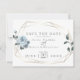 "Save the date" pour mariage | Boho couleur bleu azur roses entourent un cadre géométrique de terrarium de style or avec de la végétation sauge. Reverse est un bleu poussiéreux gratuit. Personnaliser texte, style de police, couleur et taille. OEuvre originale créée pour BarefootBride™ par © WhimsicalArtwork™ - Il s'agit d'une suite de papier à lettres Mariage complète avec papier à lettres mariage, baby shower et autres articles de papeterie d'événements correspondants.