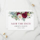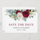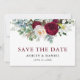 Elégante aquarelle moderne Bourgogne Flore Verdure Fiançailles Mariage Enregistrer La Carte Date comprend des pivoines, des feuilles d'eucalyptus et d'autres belles verdure.