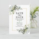 Elégant Aquarelle moderne Botanique Verdure Enregistrer La Carte Date comprend des feuilles d'eucalyptus, le feuillage botanique vert, des feuilles bleus poussiéreux et d'autres belles verdure botanique sur un cadre doré.