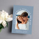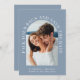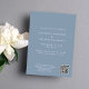 Mariage de destination bleu poussiéreux moderne enregistrer la carte de date avec votre photo dans un cadre d'arc et "Pack Your Bags And Save The Date" en texte blanc élégant. Sous votre photo, ajoutez vos prénoms, votre date de mariage et votre emplacement. Au contraire, personnalisez l'enregistrement des détails de la date dans une simple typographie et entrez l'adresse URL de votre site Web mariage pour créer un code QR scannable pour que vos invités puissent facilement visiter votre site Web.