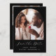 Cette simple et minimaliste carte Save the Date présente une arche photo boho au-dessus des mots "Save the Date" dans un élégant script d'écriture manuscrite blanche, suivi des noms du couple, date mariage et ville en sans serif police sur un arrière - plan noir. Ajoutez une seconde photo horizontale et un message plus détaillé avec des informations supplémentaires sur l'inverse.