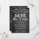 Carte de sauvegarde de mariage à l'aspect tableau noir d'ardoise de l'ensemble assorti avec un fond gris foncé charbon de bois avec un effet de tableau noir ardoise, et une écriture à la craie blanche à l'aspect manuscrit au premier plan. Le motif de tourbillon décoratif ajoute une touche d'élégance décontractée. Tous les dessins Copyright © www.CustomInvitesOnline.com