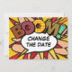 Personnalisez avec vos noms et détails pour annoncer le changement de date de votre événement spécial. Thème de pop art de bande dessinée, design moderne et rétro amusant, parfait pour les mariages, les douches de mariée, les douches de bébé, les baptêmes, les fêtes de fiançailles, les célébrations d'anniversaire, les remises de diplômes, les fêtes d'anniversaire et autres événements spéciaux tout au long de l'année ! Un design cool, tendance et amusant qui met le boum zap pow dans votre journée. Conçu par Thisisnotme©