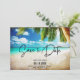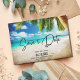 Mariage de plage aux eaux bleues tropicales sauvegardez les dates pour votre mariage de destination. Ceci à l'exception de la date peut être utilisé pour n'importe quel emplacement de plage de votre choix, il suffit de modifier le libellé sur le modèle pour répondre à vos besoins. Customisez avec vos noms, votre date de mariage et votre emplacement. Ajoutez votre photo à l'arrière de la carte.