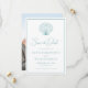 Ce simple mariage minimal de plage aqua bleu et blanc sauf la carte de date a une coquille de pétoncle en haut, élégant script calligraphie, et un cadre autour du bord, avec un modèle photo sur le dos.