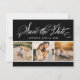 Style vintage personnalisé noir et blanc (note, noir couleur arrière - plan peut être modifié) mariage enregistrer la fonction de cartes de date "Enregistrer la date" dans un élégant style de script de calligraphie manuscrit, trois (3) espaces pour les photos fiançailles (conseil : rogner à la forme carré avant de télécharger), et du texte au dos qui peut être personnalisé avec des informations mariage.